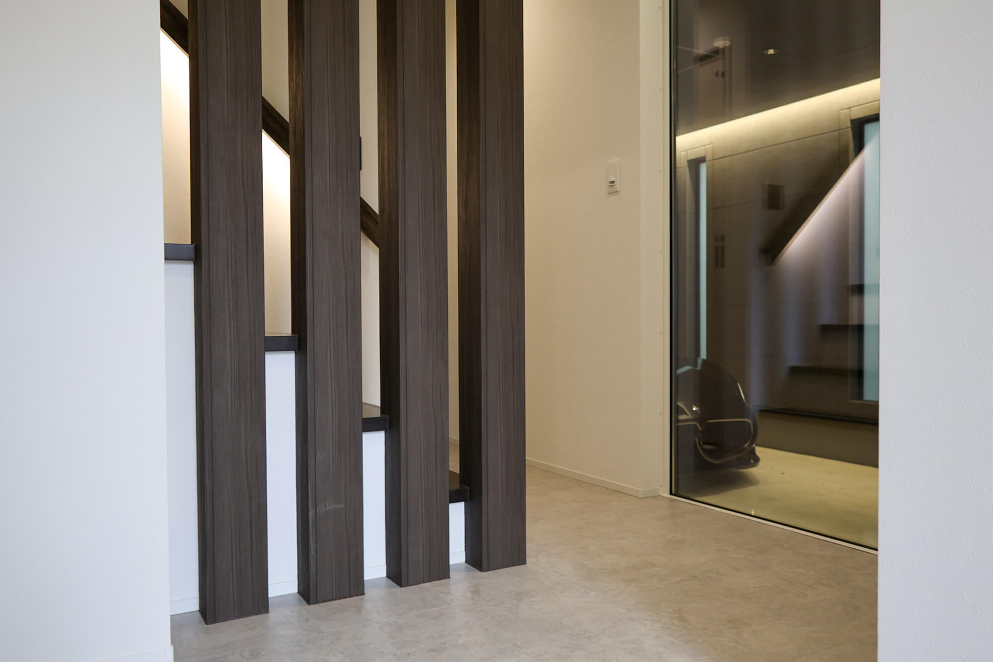 玄関の先に見える階段の間接照明も印象的で、