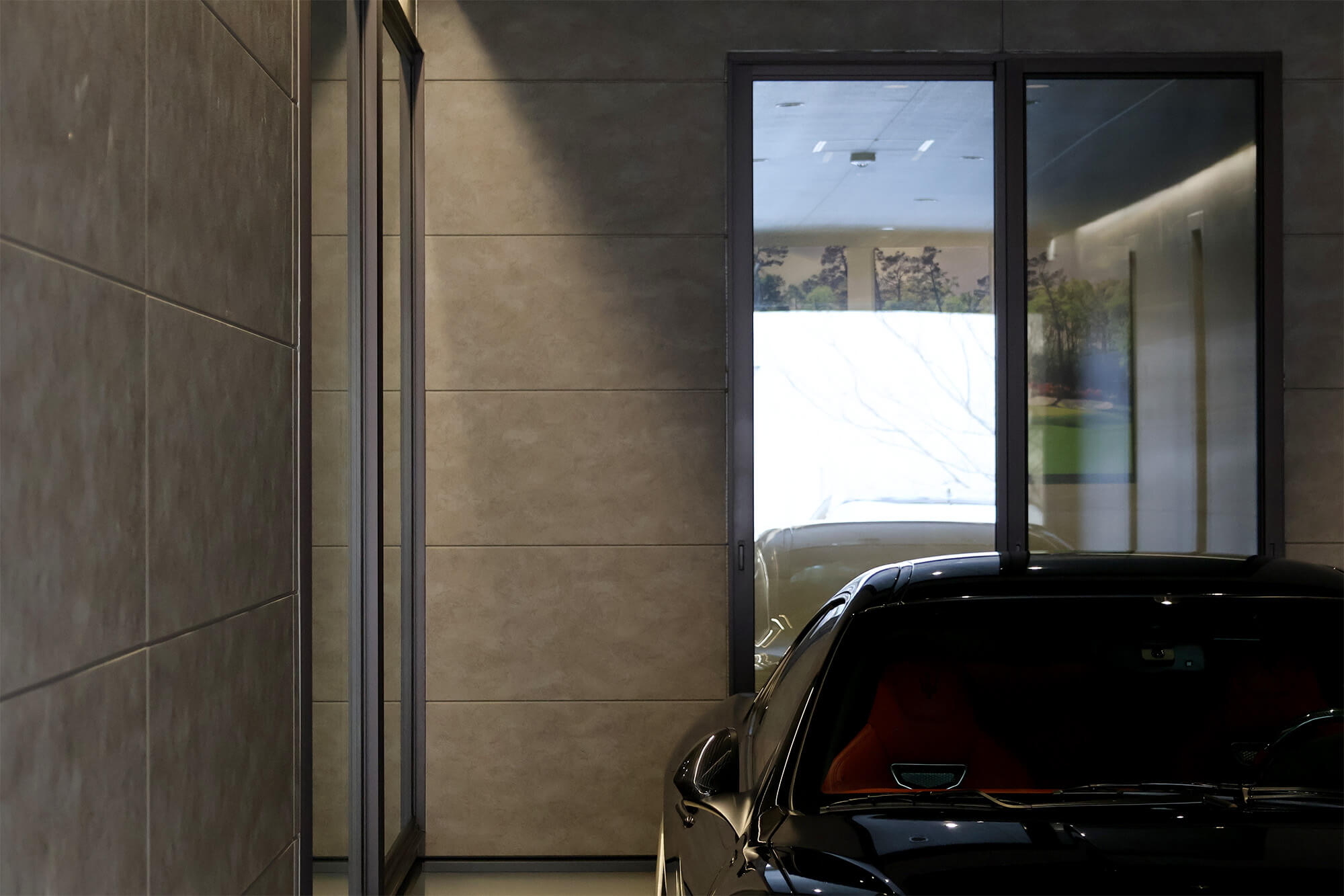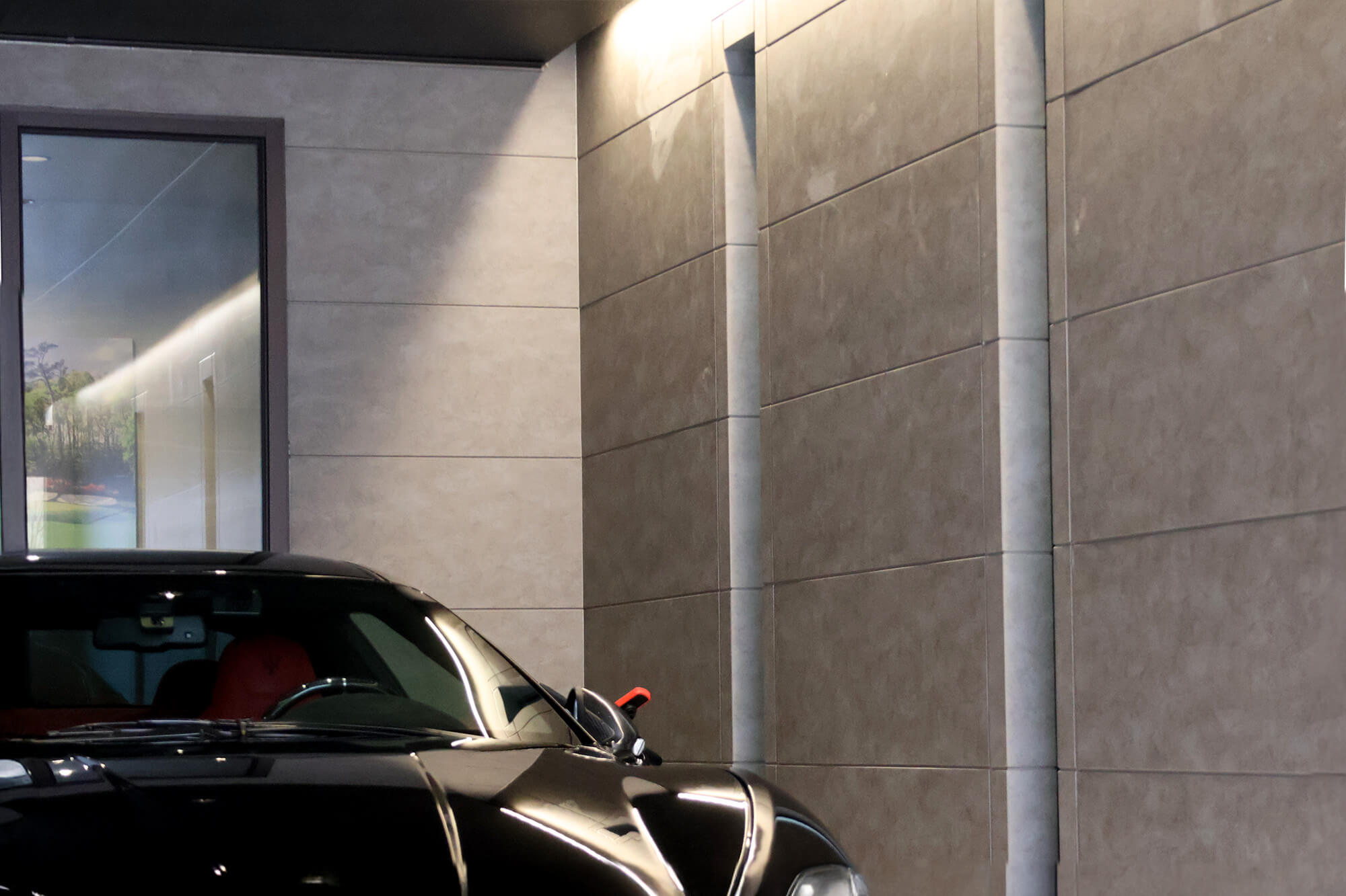 間接照明で照らされたガレージは、外とは別世界のラグジュアリーな雰囲気。