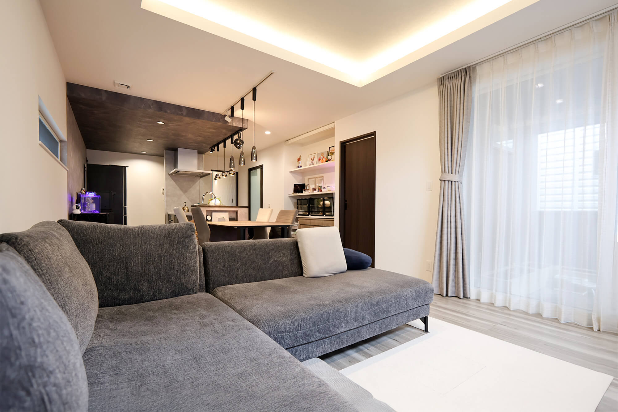間接照明を取り入れたリビングは、バルコニーからの明るさも感じられるリラックス空間。