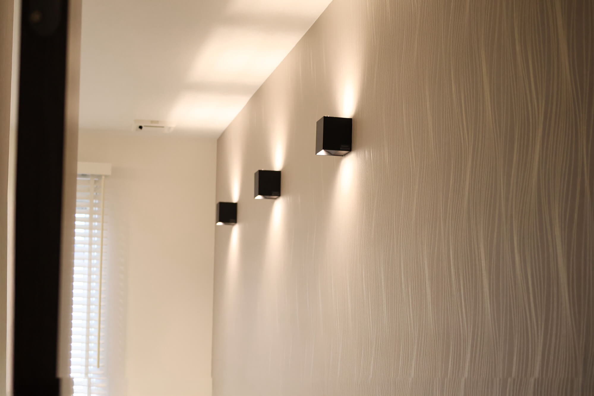 間接照明がやわらかく空間を照らし、壁紙や床材とのバランスがとても美しくまとまっています。