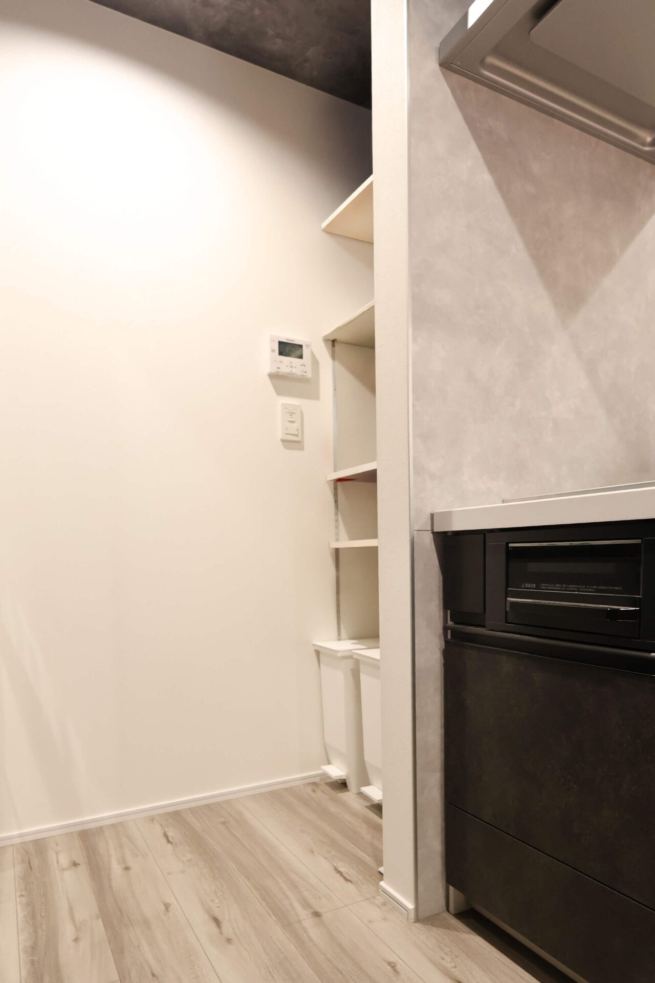 ブラックのキッチンに合わせたグレーのアクセントカラーやフローリングが、空間全体におしゃれな雰囲気を漂わせています。